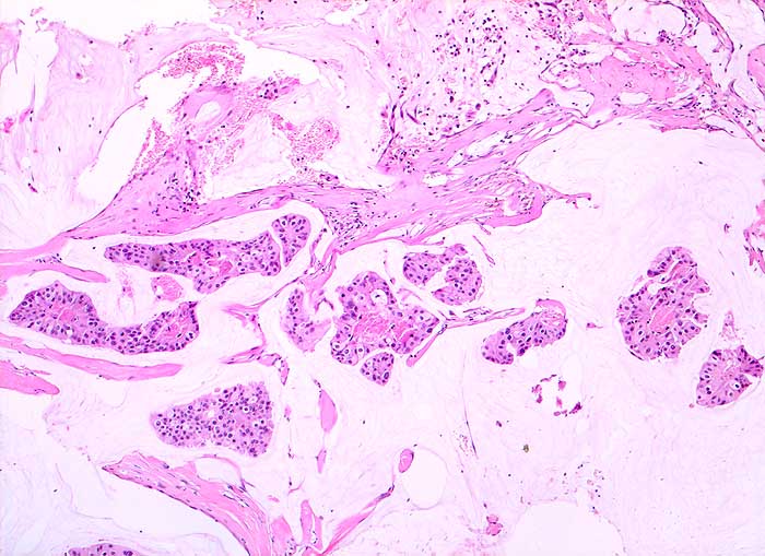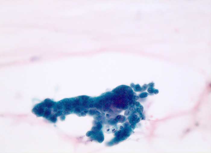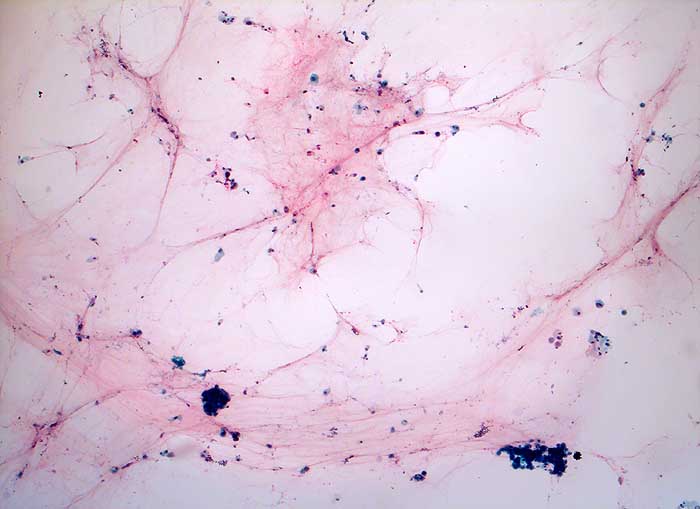 Homogene oder schlierenförmige extrazelluläre Schleimmassen mit Inseln von Tumorzellen mit geringen Kernatypien sind pathognomonisch für das muzinöse Mammakarzinom. Die Zellzahl ist meist nicht sehr hoch. Die Zellen liegen einzeln oder in kleinen kugeligen oder pseudopapillären Verbänden. Der Schleim erscheint in der Pap Färbung blau-grau bis rötlich. Siegelringkarzinome zeigen grössere intrazytoplasmatische Schleimvakuolen.