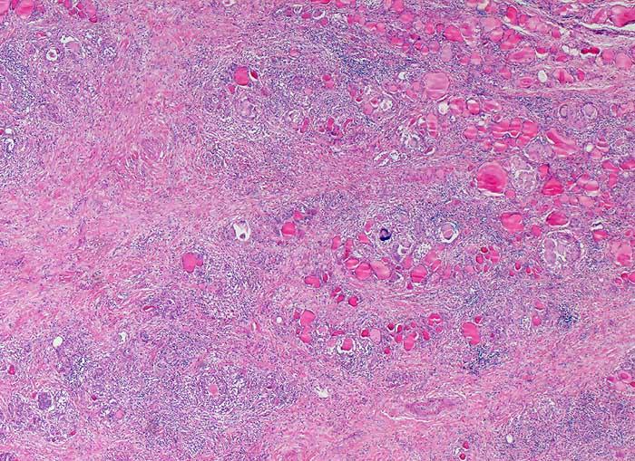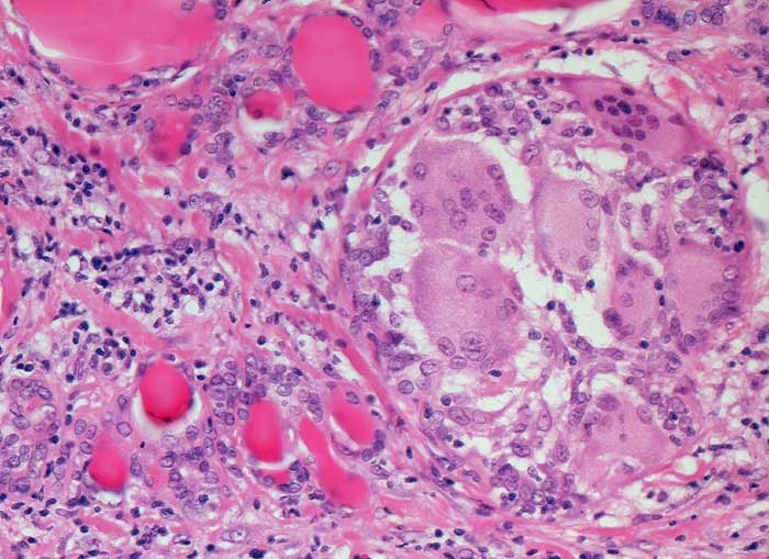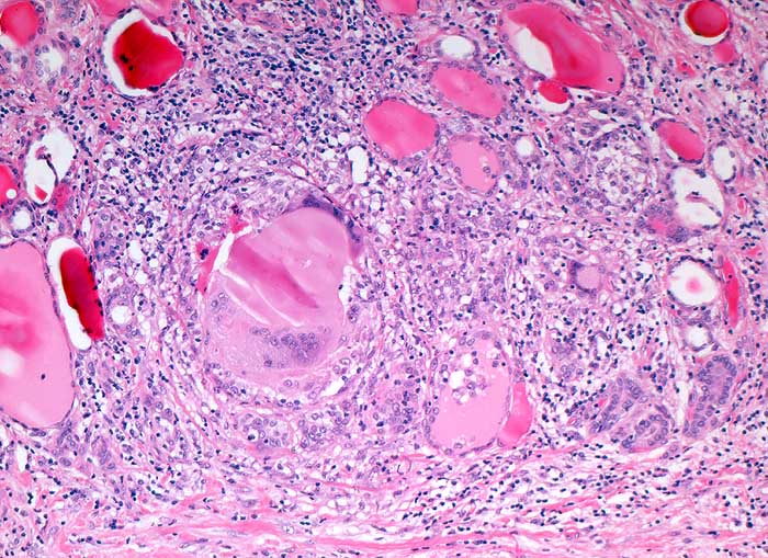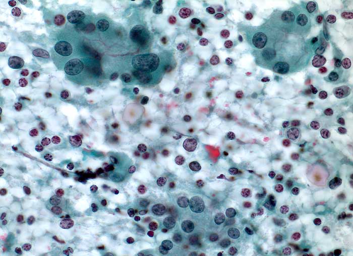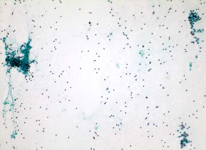 Das Zellbild wechselt in Abhängigkeit vom Stadium. Im floriden Anfangsstadium finden sich zahlreiche Lymphozyten, einige neutrophile Granulozyten und die pathognomonischen Epitheloidzellen und Riesenzellen, gelegentlich in granulomähnlichen Aggregaten. Die Follikelzellen können degenerative Veränderungen und eine deutliche Polymorphie aufweisen. Im Verlauf der Erkrankung nimmt die Zellularität ab. Bei eindeutigem zytologischem Befund kann auf eine histologische Abklärung verzichtet werden. Die Thyreoiditis De Quervain stellt keine Indikation für einen operativen Eingriff dar.