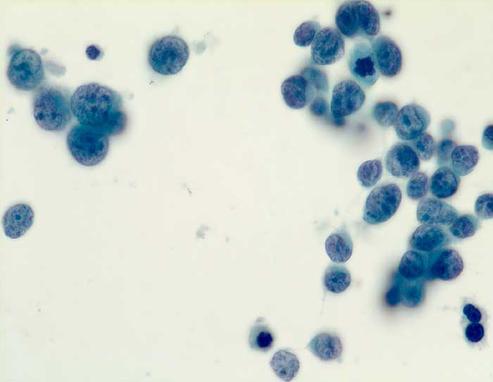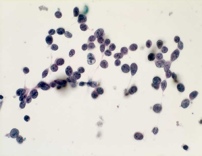 Die Tumorzellen des kleinzelligen Karzinoms erscheinen in der Übersicht eher einförmig. Bei stärkerer Vergrösserung zeigt sich aber eine deutliche Polymorphie. Die Kerne sind rundlich, eckig oder spindelig und je nach Erhaltungszustand mehr oder weniger hyperchromatisch. Der Kernhintergrund ist dunkel und das Chromatin fein dispers. Nukleolen sind meist unscheinbar. Plumpe grosse Nukleolen sprechen eher für ein grosszellig neuroendokrines Karzinom, dessen Morphologie im Übrigen mit derjenigen des kleinzelligen Karzinoms überlappt. Die Abgrenzung von einem Lymphom oder aktivierten Lymphozyten kann schwierig sein.
