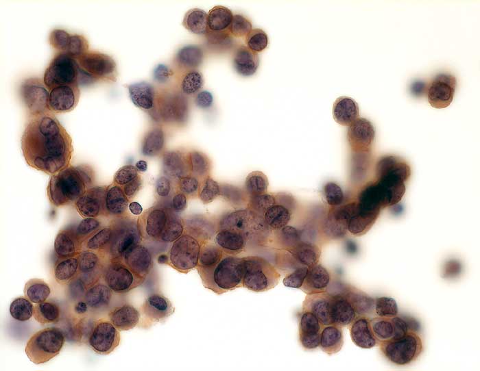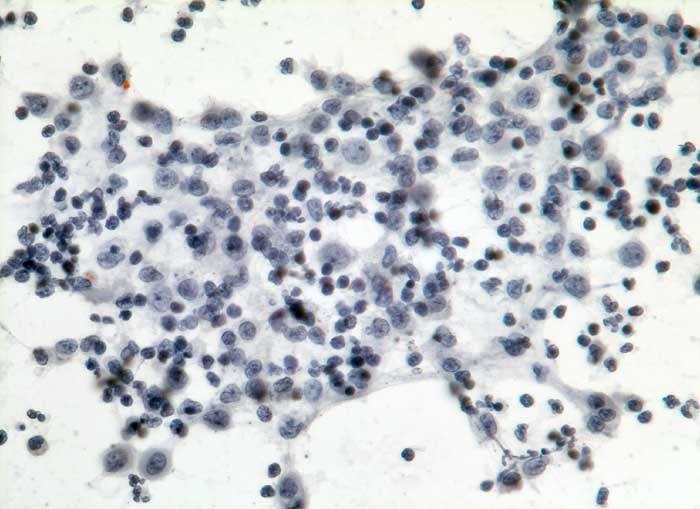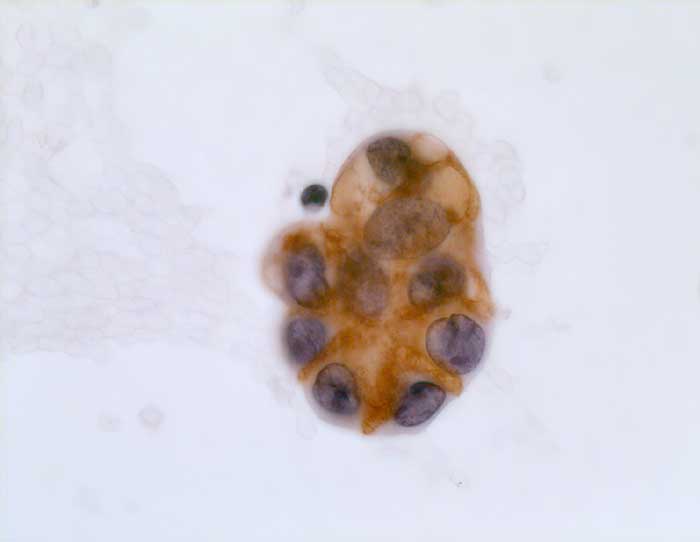 Unterscheidung von Adenokarzinomen und kleinzelligen Karzinomen (positiv) von benignen oder malignen Mesothelzellen im Erguss (negativ).