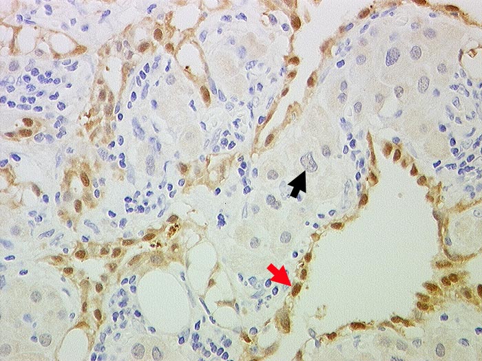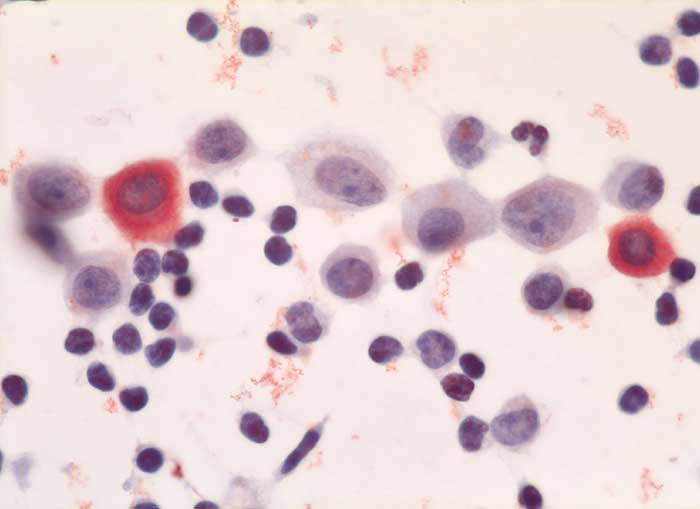 - Unterscheidung von reaktiven Mesothelzellen oder Mesotheliomen (etwa 80% positiv) von Karzinomen (bis zu 20% meist nur fokal positiv) im Erguss.