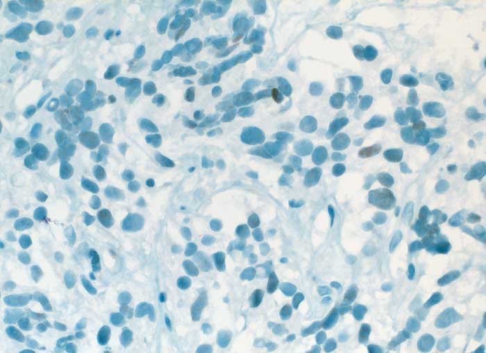 Unterscheidung von Hautmetastasen eines kleinzelligen Bronchuskarzinoms (TTF-1+, CK20-) von einem Merkelzellkarzinom (TTF-1-, CK20+).