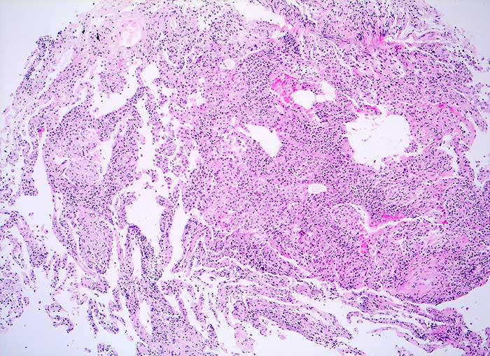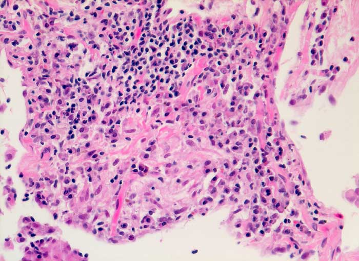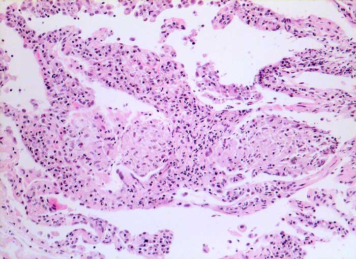 Die exogene allergische Alveolitis (Hypersensitivitätspneumonie) ist eine Entzündungsreaktion der Lunge, die bei prädisponierten Individuen durch pflanzliche oder tierische Inhalationsantigene ausgelöst werden kann. Die BAL Befunde hängen vom Stadium der Erkrankung ab. In der perakuten Phase überwiegen neutrophile Granulozyten. Ausserdem sind in den ersten Tagen der Exposition die Mastzellen auf über 1% erhöht (mehr als 3/10 HPF), um nach 1 bis 3 Monaten wieder auf Normalwerte abzufallen. Bei aktiver EAA besteht oft eine extreme Lymphozytose von 60-70%. Bei chronischer Erkrankung sind Schaumzellen, einige eosinophile Granulozyten und als Ausdruck der Fibrose reichlich neutrophile Granulozyten nachzuweisen.