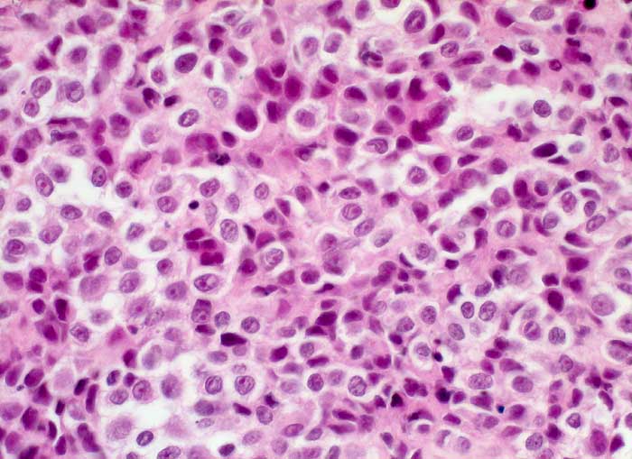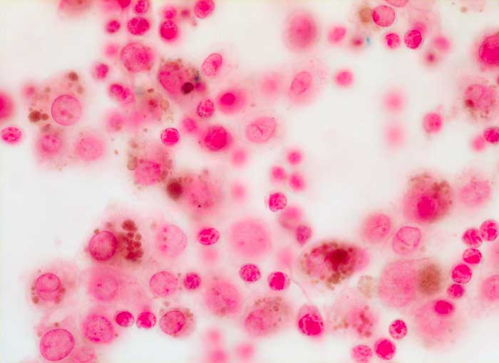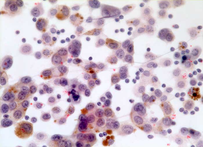Der Nachweis von eisennegativem Pigment und die Positivität für den melanozytären Marker HMB-45 in malignen Zellen bestätigt die Diagnose eines malignen Melanoms.