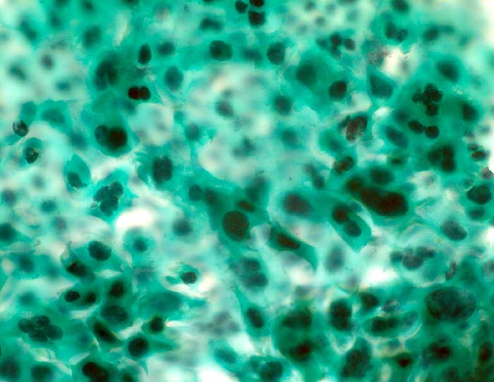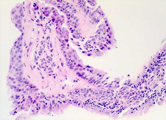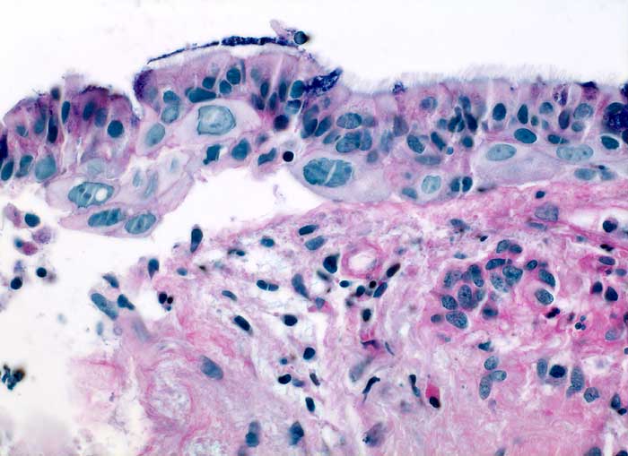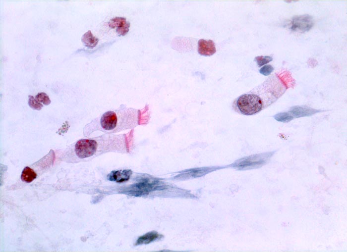 Nach Strahlentherapie eines mediastinalen Tumors oder eines Bronchuskarzinoms zeigen Bronchial- und Alveolarepithel ähnliche Kernveränderungen wie nach Zytostatikatherapie. Die Flimmerzellen haben unterschiedlich stark vergrösserte oft hyperchromatische und entrundete Kerne, sowie fragiles Zytoplasma. Der Nachweis von Flimmerhaaren und die erhaltene Kern-Zytoplasmarelation sprechen für reaktiv veränderte Bronchialepithelien.