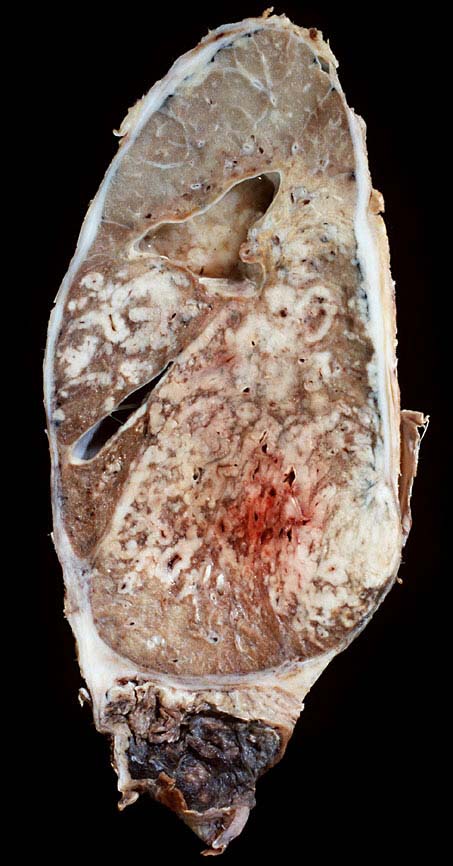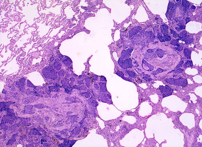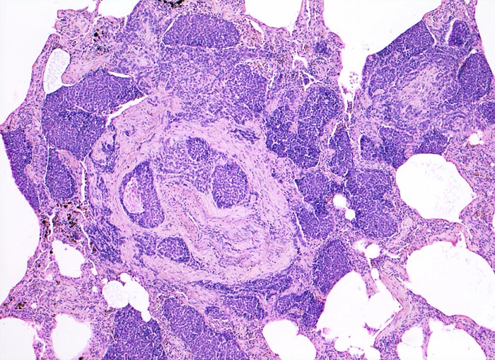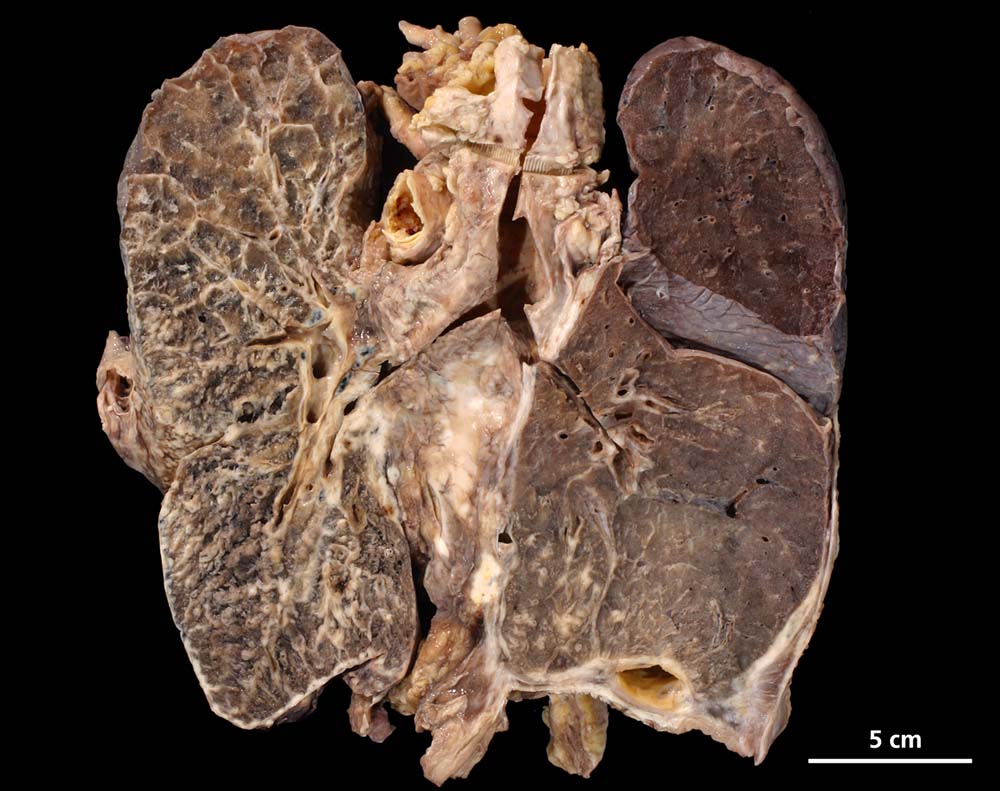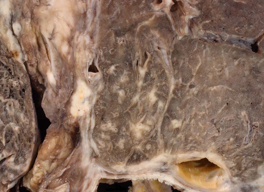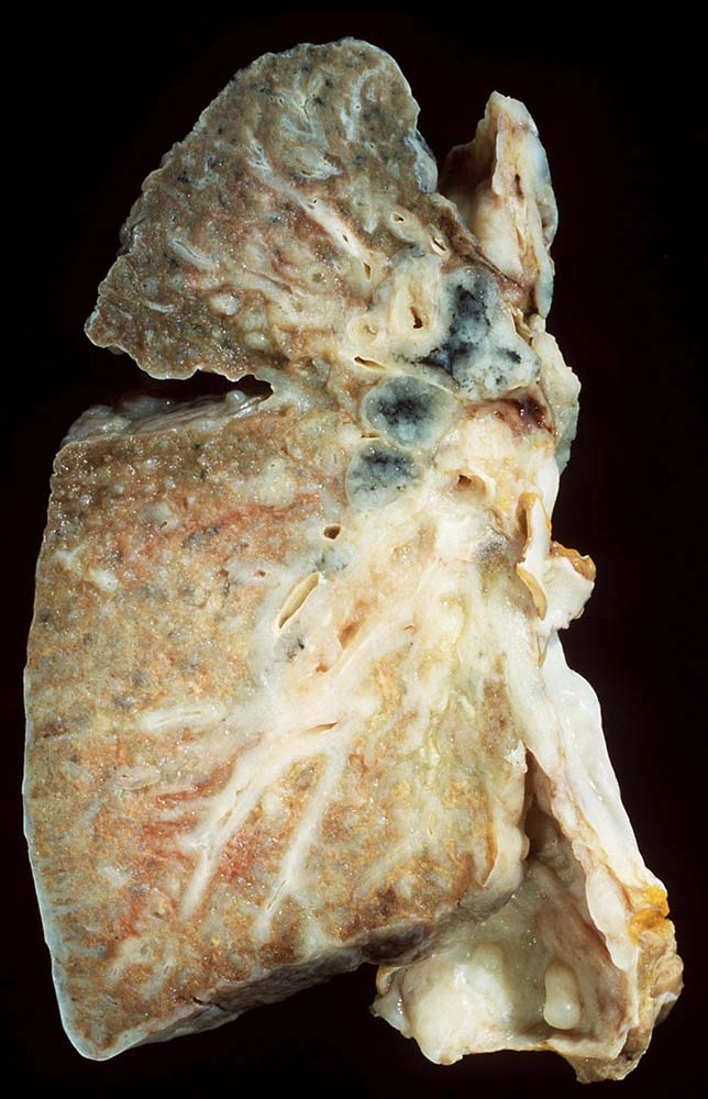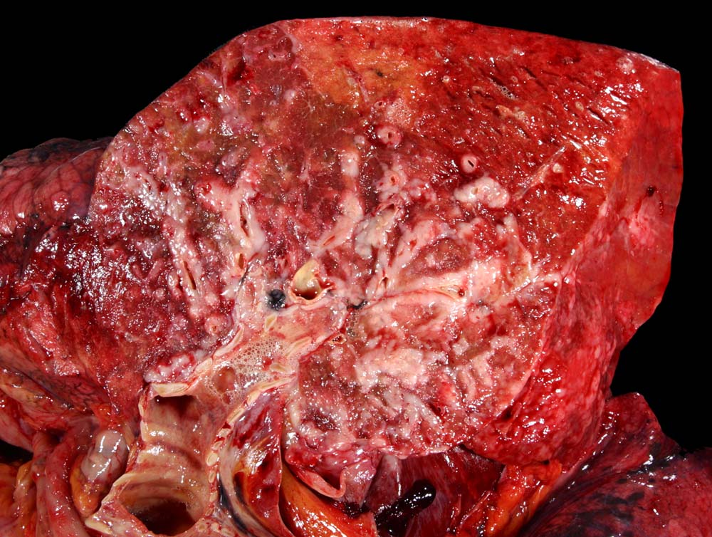 Das metastatische Wachstumsmuster von primären Bronchuskarzinomen und extrapulmonalen Tumoren innerhalb der Lunge ist variabel. Hämatogene Metastasen imponieren makroskopisch als multiple scharf begrenzte rundliche Knoten in allen Lappen meist in peripherer Lage. Der metastatische Befall von Lymphknoten kann durch direkte Tumorinfiltration durch den Primärtumor erfolgen (=per continuitatem) oder über die Lymphgefässe. Bei einer ausgeprägten lymphogenen Tumorausbreitung erscheinen subpleurale mit Tumor gefüllte Lymphgefässe makroskopisch als prominente weisse Streifen. Mikroskopisch lassen sich Tumorinfiltrate in peribronchialen und perivaskulären Lymphgefässen nachweisen (=Lymphangiosis carcinomatosa). Hepatozelluläre Karzinome metastasieren typischerweise in Form von Tumorembolien (> 1279) hämatogen in die Lunge.