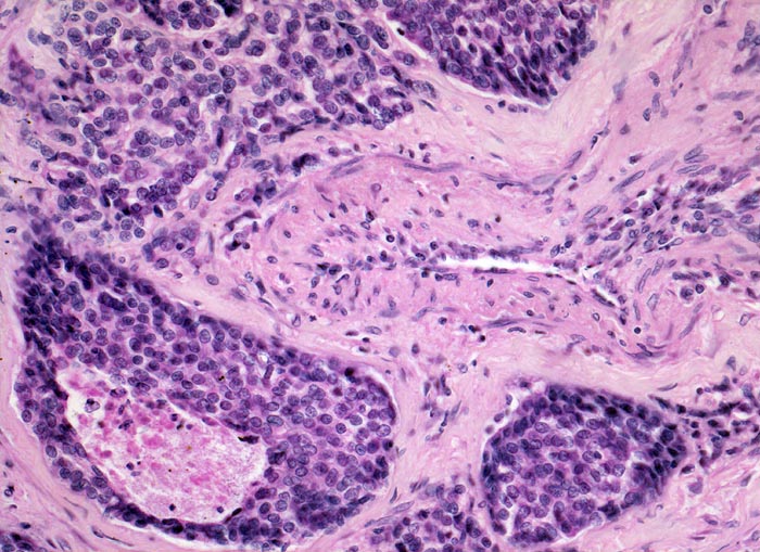 • In den sternförmigen Ausläufern finden sich erweiterte Endothelausgekleidete Lymphgefässe in der Nachbarschaft von Blutgefässen.