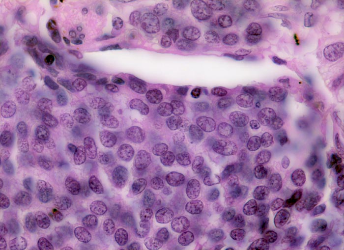 • Die erweiterten Lymphgefässe enthalten solide Tumorzellaggregate.