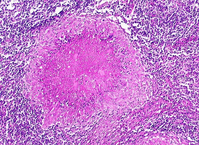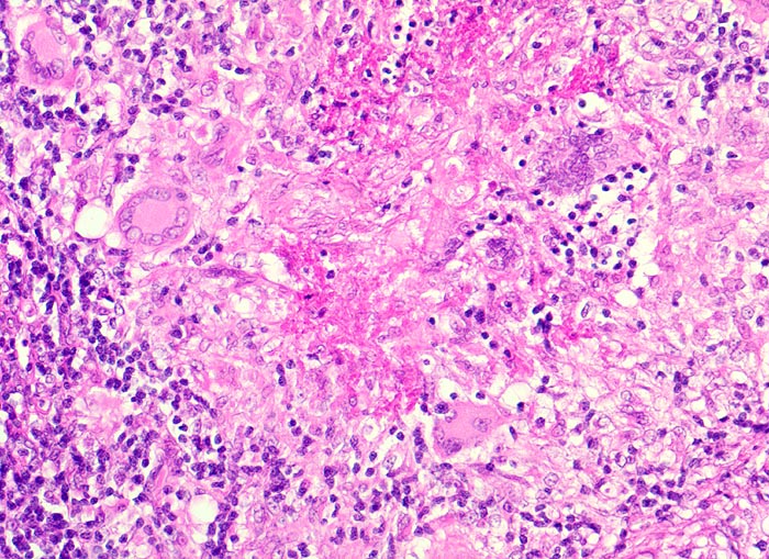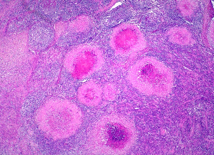 • Demarkierung der Nekroseareale durch schlanke Epitheloidzellen, Riesenzellen vom Langhanstyp mit hufeisenförmig angeordneten Kernen und Lymphozyten.
