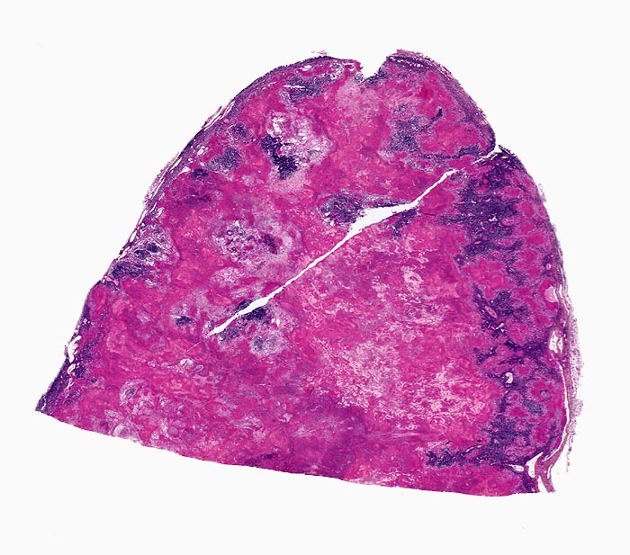 • Lymphknoten mit ausgedehnten konfluierenden eosinophilen Nekrosezonen und nur wenig erhaltenem Lymphknotengewebe (blau).