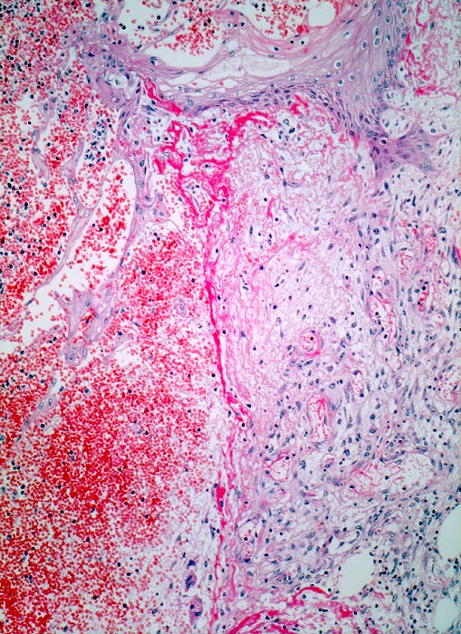 - Zweite Phase: Aufbau von Granulationsgewebe (= zell- und gefäßreiches Bindegewebe). Die Kapillarisierung (Neovaskularisation) durch Einsprossen von Blutgefäßen (Gefäßbäumchen sind als hellrote, glänzende Körnchen im Wundgrund sichtbar) sorgt für ausreichende Ernährung des Gewebes. Die Kollagensynthese durch eingewanderte Fibroblasten benötigt Vitamin C und Sauerstoff.