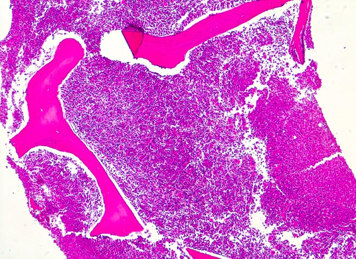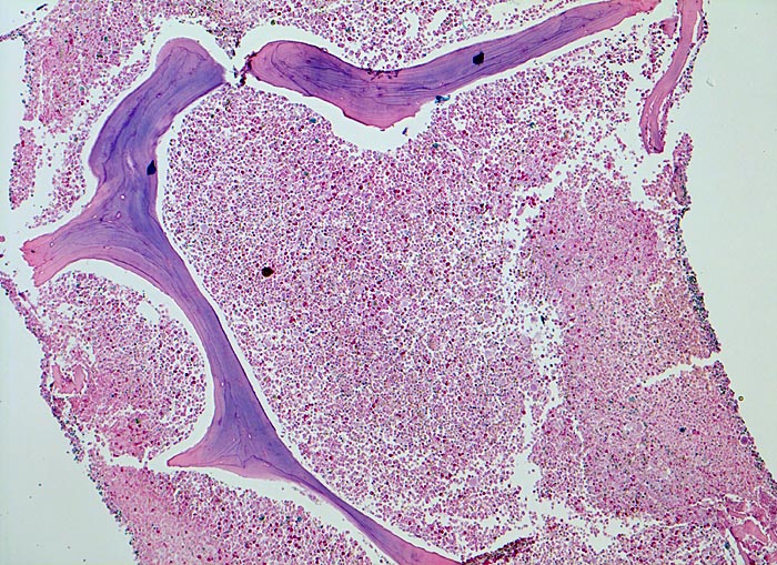 - Fast 100% Zellularität des blutbildenden Marks (praktisch keine Fettzellen, sogenanntes "packed marrow").