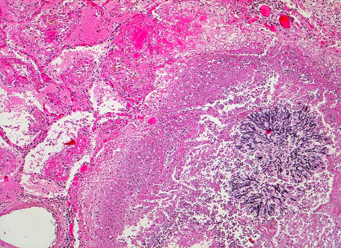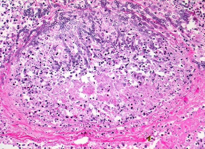 Aspergillus unterscheidet sich von anderen Pilzen (> 1462) (> 712) durch häufige Verzweigungen der Hyphen in einem Winkel von 45°, die radiär in grossen Kolonien liegen (> 547) (> 556). Besonders gut sind die Pilze in der PAS (> 717) und in der Grocott (> 189) Färbung nachweisbar. Die vier häufigsten durch Aspergillen hervorgerufenen Lungenerkrankungen sind die allergische bronchopulmonale Aspergillose, die chronische nekrotisierende Aspergilluspneumonie, das Aspergillom oder wie in diesem Fall die invasive Aspergillose. (Näheres zu den verschiedenen Krankheitsbildern im Literaturlink). Bei Immunsupprimierten invadieren die Pilze häufig die Gefässe. Dies führt zu Infarkten, Blutungen und Nekrosen der Lunge. Über die Invasion der Gefässe kommt es zur septischen Streuung (> 715) (> 49) im grossen Kreislauf.