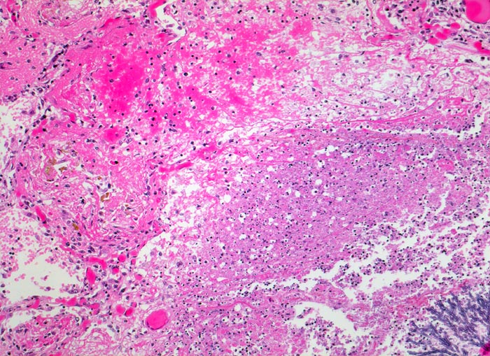 • Hämorrhagischer Randsaum um die Nekrose: Hyperämische Alveolarwandkapillaren. Alveolen angefüllt mit Blut, Fibrin und Alveolarmakrophagen.