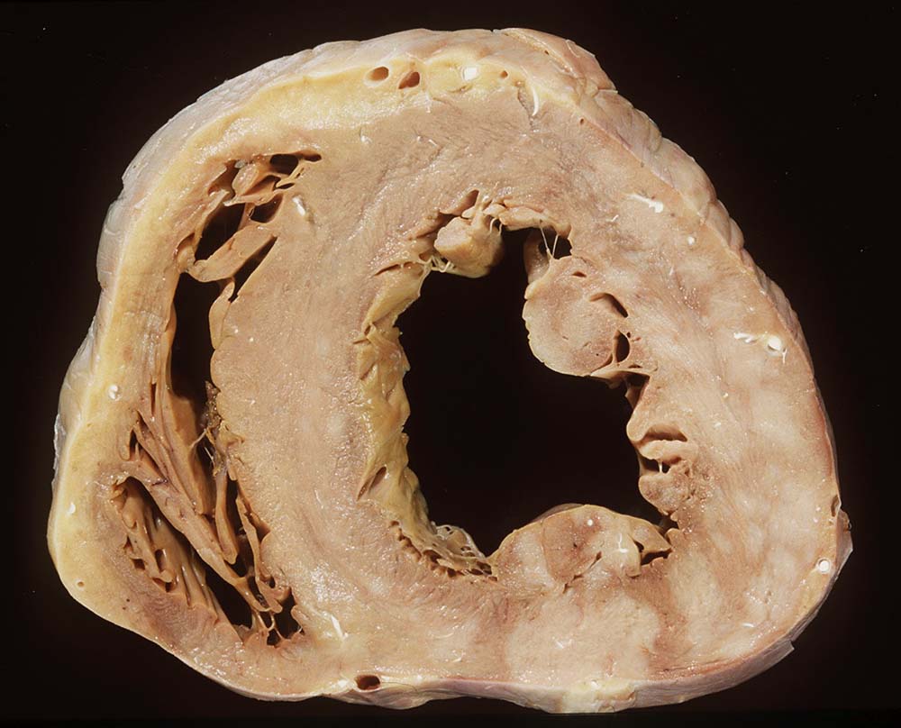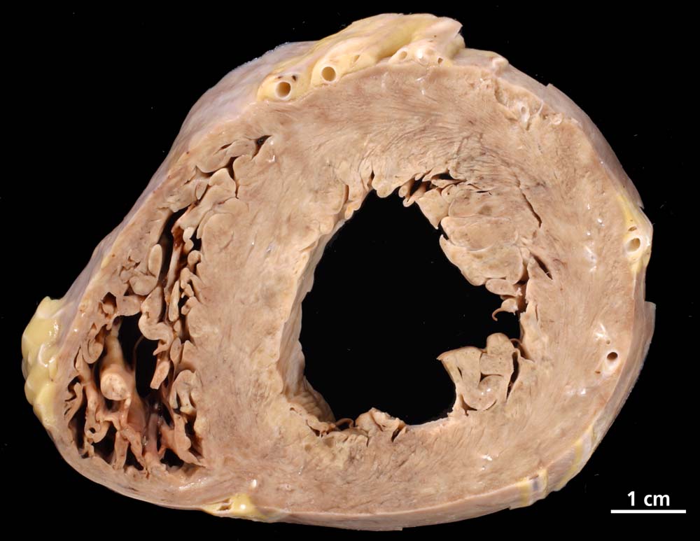 Symptomatik bei kardialer Amyloidose: Die Ablagerung von Amyloidprotein um die Muskelfasern des Myokards verursacht eine Versteifung der Herzmuskulatur (restriktive Kardiomyopathie) und eine Herzinsuffizienz bei grösseren Mengen von abgelagertem Amyloidprotein. Durch die Ablagerungen sind die Herzwände verdickt. Häufig ist im EKG die Höhe der QRS-Komplexe vermindert (Niedervoltage). Wenn das Erregungsleitungssystem des Herzens betroffen ist, können Herzrhythmusstörungen auftreten. Der Befall der Herzkranzgefäße kann Ischämien verursachen.