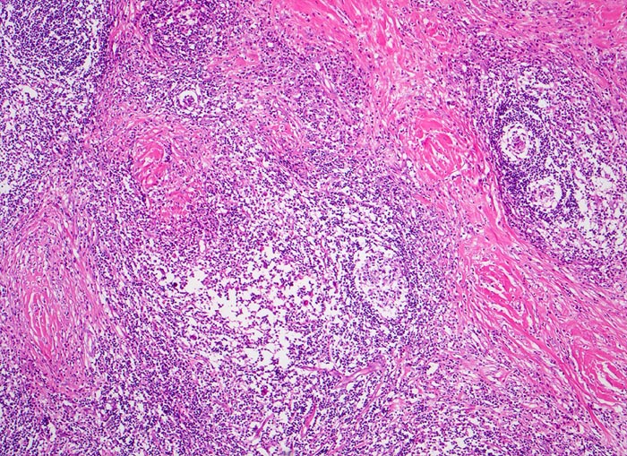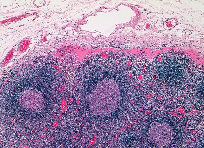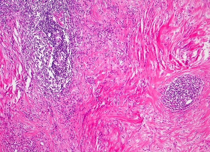 • Die Knoten bestehen vorwiegend aus einem Mischzellinfiltrat reaktiver Zellen: Lymphozyten, Histiozyten, eosinophile Granulozyten und Plasmazellen.