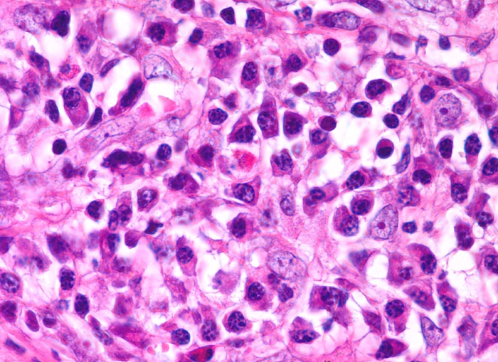 • Reed-Sternbergzelle mit spiegelbildlich angeordneten Kernen mit sehr grossen eosinophilen Nukleolen.