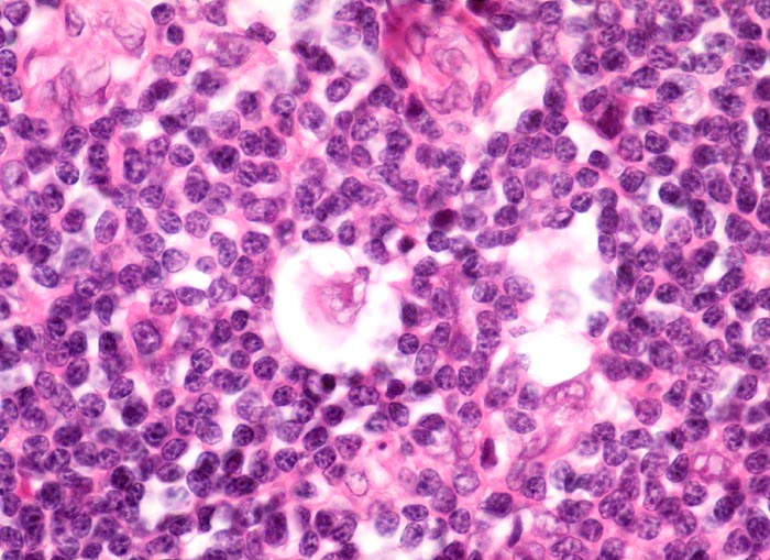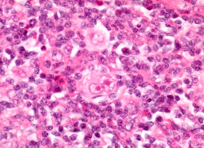 • Einkernige Hodgkinzelle mit prominentem Nukleolus umgeben von einem Retraktionsartefakt (Lakunarzelle).