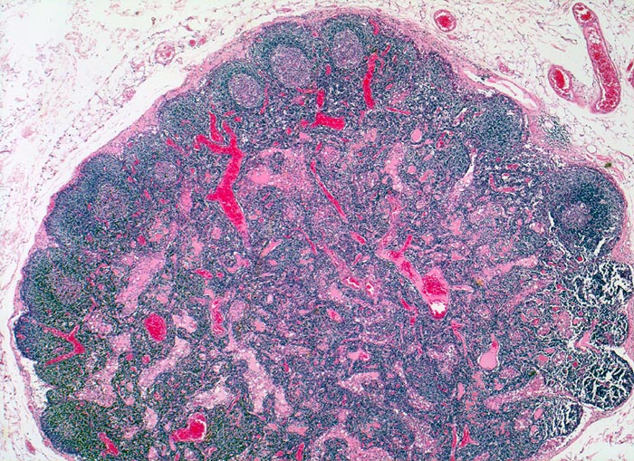 Das Hodgkin-Lymphom befällt primär lokal eine Lymphknotengruppe, meist des Halses und breitet sich entlang des lymphatischen Gewebes aus. Bei nodulärer Sklerose (ca 70% aller cHL) findet sich in den meisten Fällen eine mediastinale Tumormasse.