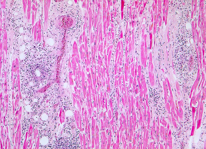• Einzelne Herzmuskelzellen werden durch das Entzündungsinfiltrat zerstört und sind hypereosinophil (Myozytolyse).