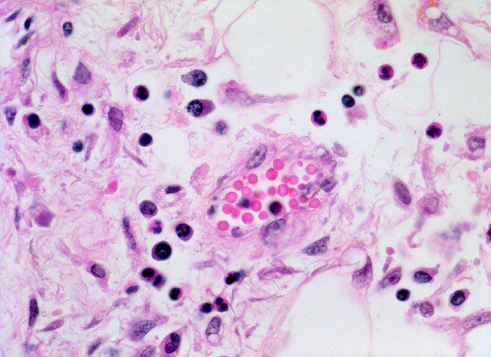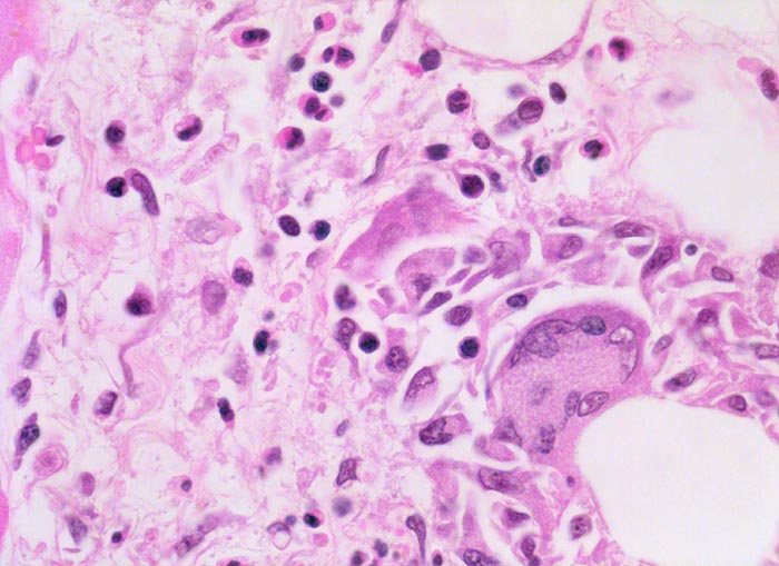 • Teils fleckförmiges, teils diffuses gemischtes Entzündungsinfiltrat aus Lymphozyten, Plasmazellen, Makrophagen und zahlreichen eosinophilen Granulozyten.