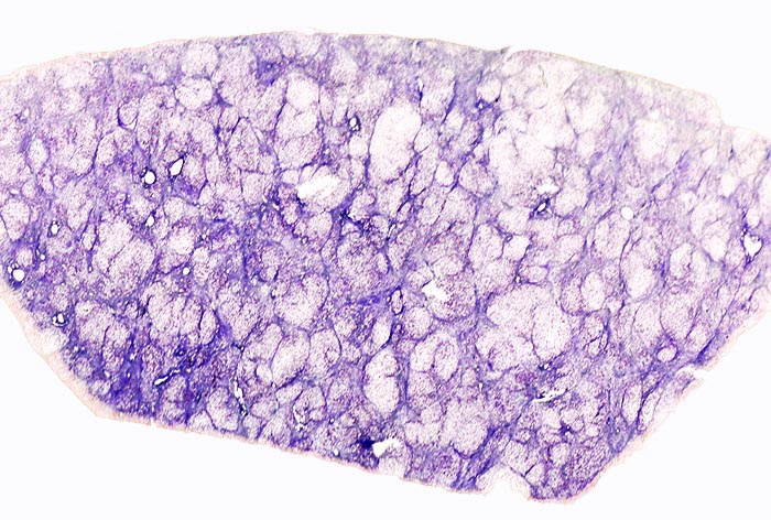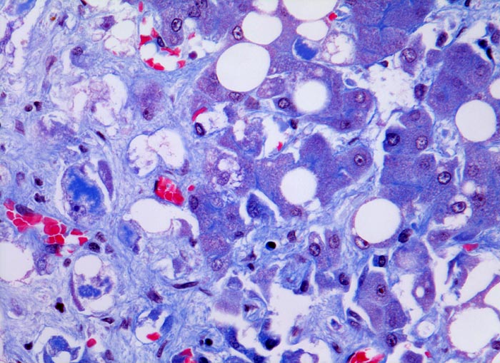 Definition: Ein Aethylabusus kann zu unterschiedlichen Veränderungen in der Leber führen. Die Leberverfettung (Steatose, alkoholische Fettlebererkrankung AFLD) ist das erste histologische Zeichen einer aethylischen Leberschädigung und tritt bei schwerem chronischem Aethylabusus in über 90% auf. Hinzukommen kann eine Entzündung (=Steatohepatitis) und schliesslich eine Fibrose (=chronisch sklerosierende Steatohepatitis). Das fortgeschrittenste Stadium, die Leberzirrhose ist definiert als diffuser Prozess mit Fibrose und Umwandlung der normalen Läppchenarchitektur in strukturell abnorme Knoten mit vaskulärer Architekturstörung.