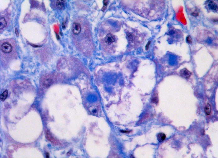 Morphologie: Meist findet sich eine grobtropfige oder gemischttropfige Verfettung des Parenchyms. Schon im Frühstadium der alkoholischen Steatohepatitis kann eine perizelluläre Maschendrahtfibrose, perisinusoidale und perivenuläre Fibrose mit Beginn in der Zone 3 festgestellt werden. Die Kombination von perivenulärer und perizellulärer ( 1096) Fibrose wird bei starker Ausprägung mit Arealen von dichter Kollagenfaserbildung auch als zentrale sklerosierende hyaline Nekrose bezeichnet. Wenn der Vernarbungsprozess fortschreitet, kann die perivenuläre Fibrosezone mit vernarbten Portalfeldern verschmelzen. Zentralvenen verschwinden oder sind stark in der Anzahl reduziert. Eine Phlebosklerose oder Obliteration der Zentralvenen kann hinzukommen. Breite Bänder von fibrotischem Gewebe mit Ductulusproliferationen und gemischtem Entzündungsinfiltrat umgeben die bei alkohlischer Zirrhose meist kleinen Regeneratknoten (=mikronoduläre Leberzirrhose mit Regeneratknoten von weniger als 3mm Durchmesser). Bei längeren Abstinenzphasen kann sich aufgrund der gesteigerten Regeneration auch eine gemischtknotige Zirrhose ausbilden. Ein gleichzeitiges Vorliegen einer Steatose oder Steatohepatitis (Steatose+neutrophile Granulozyten) in einer alkoholischen Leberzirrhose signalisiert in der Regel einen fortgesetzten Aethylabusus. Typisch für alkoholtoxische Leberschädigung sind Mallory-Denk Körperchen ( 3021), Megamitochondrien ( 3022) und eine Zellschwellung (=Ballonierung) aufgrund einer gestörten Albuminausschleusung. Oft können mässige Mengen von Hämosiderinablagerungen vor allem in den Kupffer Zellen nachgewiesen werden. Weitgehend identische morphologische Veränderungen wie bei der aethylischen Leberschädigung finden sich auch bei der nicht alkoholischen Steatohepatitis (NASH) d.h. bei Patienten, die keinen oder nur wenig Alkohol konsumieren.