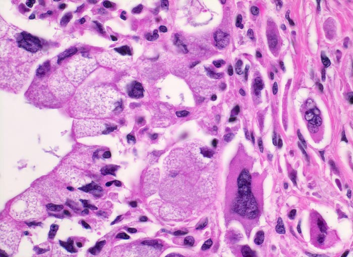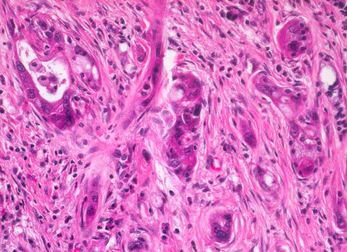Die meisten Pankreaskarzinome sind mässig bis hoch differenziert und führen zu einer deutlichen desmoplastischen Stromareaktion (derbe Konsistenz). Hochdifferenzierte Tumoren (> 1502) können sehr ähnlich aussehen wie eine chronische Pankreatitis (> 4243). Im Gegensatz zur Pankreatitis sind die neoplastischen Drüsen verformt oder rupturiert und zeigen zelluläre Atypien (grosse polymorphe Kerne mit prominenten Nucleolen). Die Tumordrüsen sind unregelmässig im Stroma angeordnet und nicht lobulär wie in der Pankreatitis. Nicht selten ist eine Nervenscheideninvasion nachweisbar (> 5884). Gelegentlich zeigen die Gänge im tumorfreien Parenchym dysplastische Veränderungen oder der Tumor breitet sich intraduktal entlang des Pankreasganges aus.