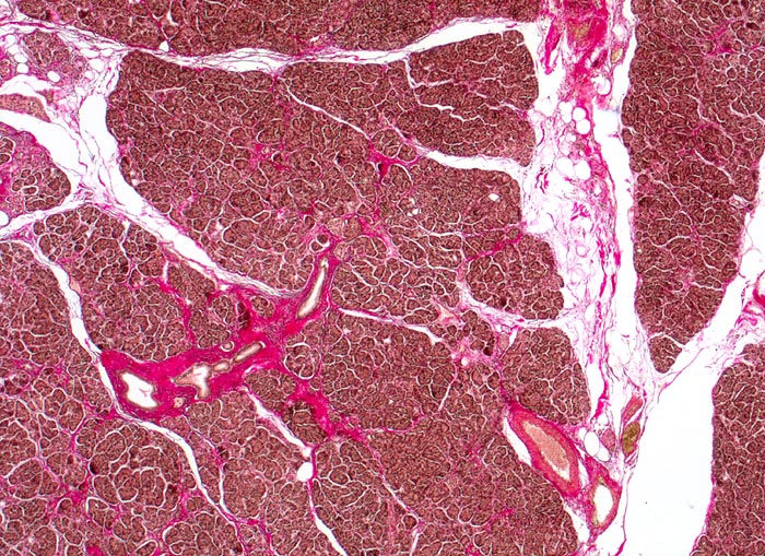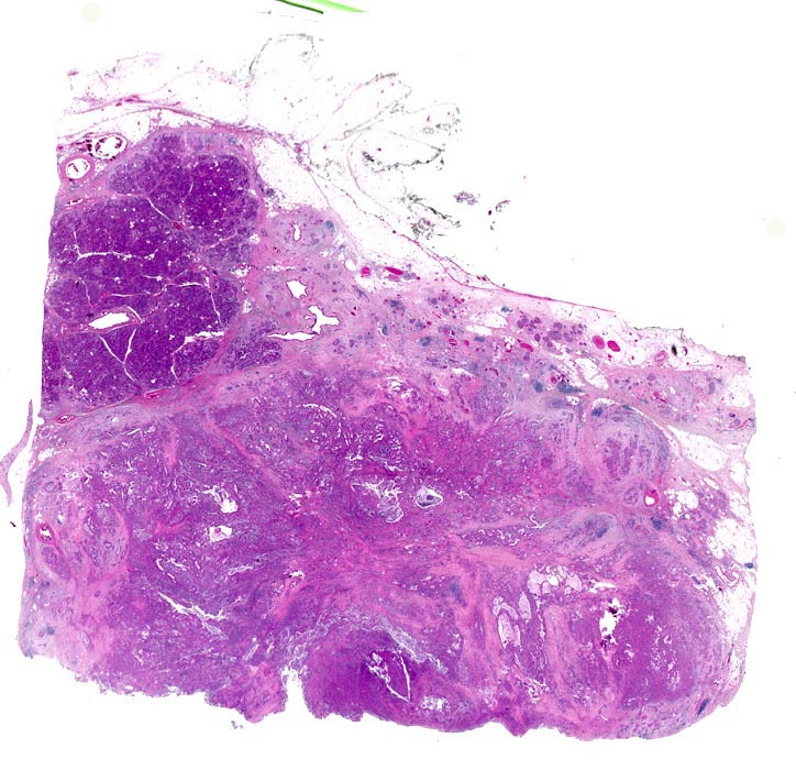 • Rechts oben Reste von nicht neoplastischem Pankreasparenchym mit fokaler chronisch obstruktiver Pankreatitis als Folge von tumorbedingten Gangobstruktionen: Vollständige Atrophie des exokrinen Pankreas bei erhaltenen Inseln. Ersatz des atrophen Parenchyms durch Fibrose. Chronisches Entzündungsinfiltrat.