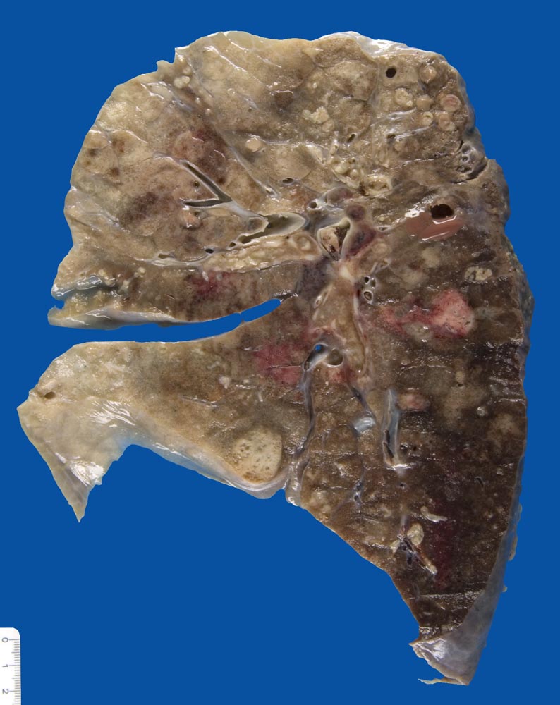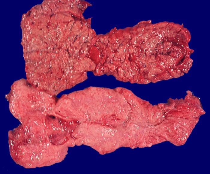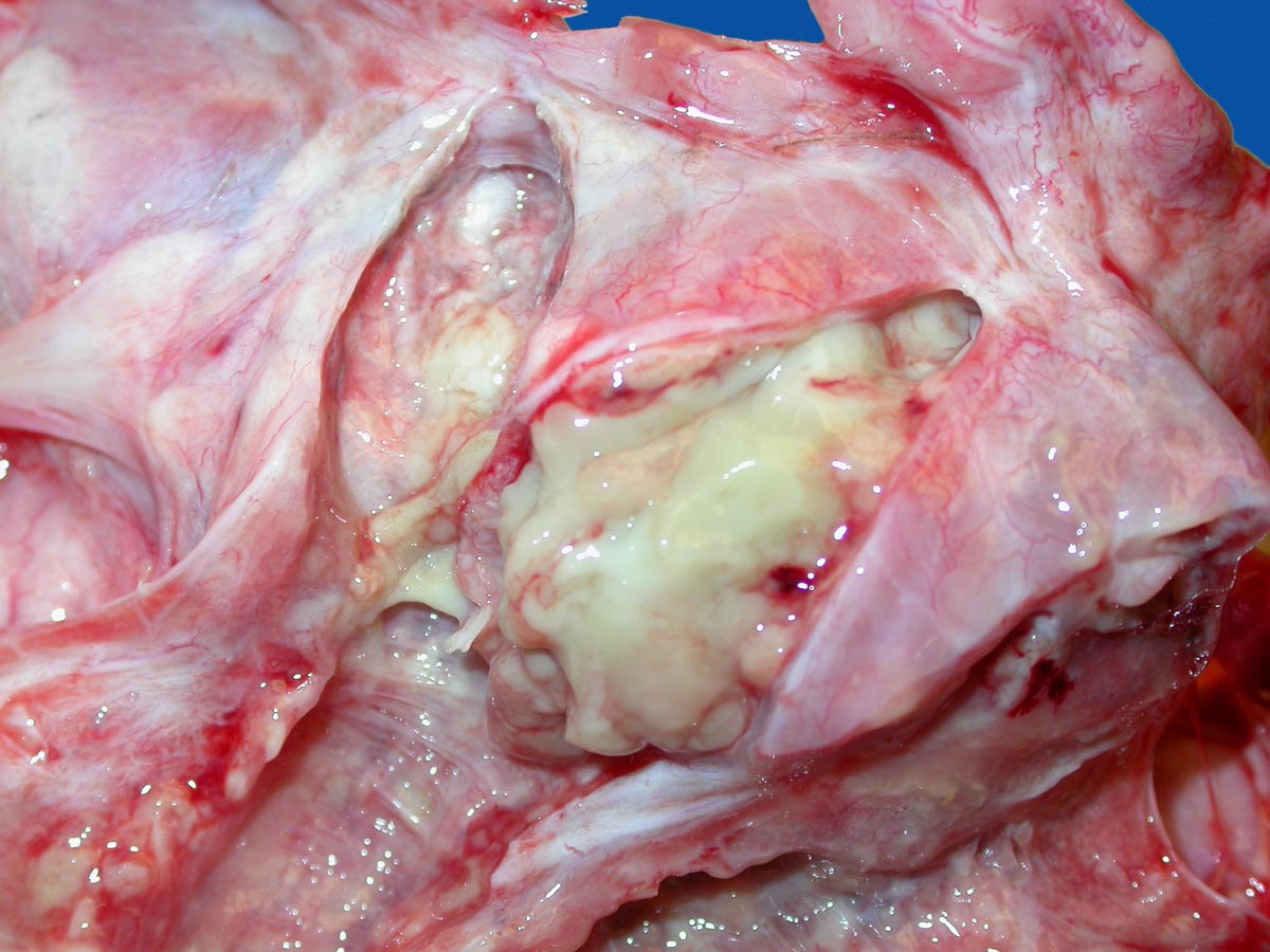 Fast alle exokrinen Drüsen sind betroffen. Pankreasgänge, intestinale Drüsen, intrahepatische Gallengänge und die Glandula submandibularis sind obstruiert durch visköses oder solides eosinophiles Material. Tracheobronchiale und Brunner’sche Drüsen bilden vermehrten Schleim. Schweissdrüsen, kleine Speicheldrüsen und Glandula Parotis sind histologisch normal, sezernieren aber vermehrt Natrium und Chlorid. Veränderungen in der Lunge (> 3689) entwickeln sich als Folge von Luftwegsobstruktion und Infekten (initial vor allem mit Staphylococcus aureus, später meist Pseudomonas aeruginosa).