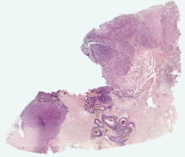 - Im Zentrum der Nekrose thrombosierte Gefässe umgeben von einem Saum vitaler Tumorzellen.