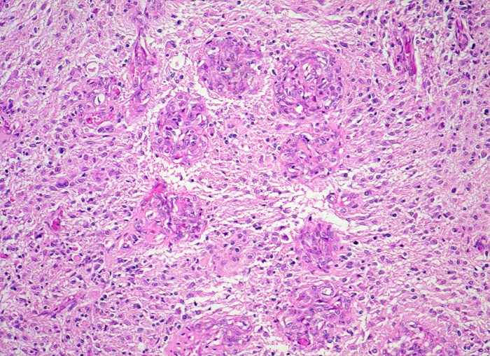 Ein Glioblastom liegt vor, wenn mindestens 3 der folgenden 4 histologischen Kriterien erfüllt sind: Kernatypien (Hyperchromasie und/oder Form- und Grössenvariabilität), Mitosen, Endothelproliferation (Gefässlumina von mehr als einer Lage Endothelzellen umgeben) und flächenhafte oder girlandenartig angeordnete Nekrosen. Ein Teil der Glioblastome entwickelt sich sekundär aus diffusen Astrozytomen Grad II. Bei den übrigen handelt es sich um sogenannt "de novo" entstandene Glioblastome.