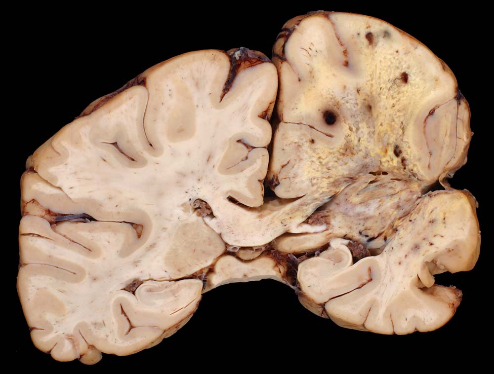 - Zellreicher Tumor mit sehr unscharfer Begrenzung zum normalen Hirnparenchym (rechts unten).