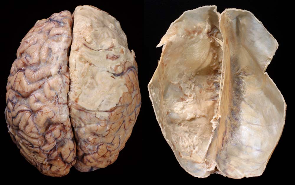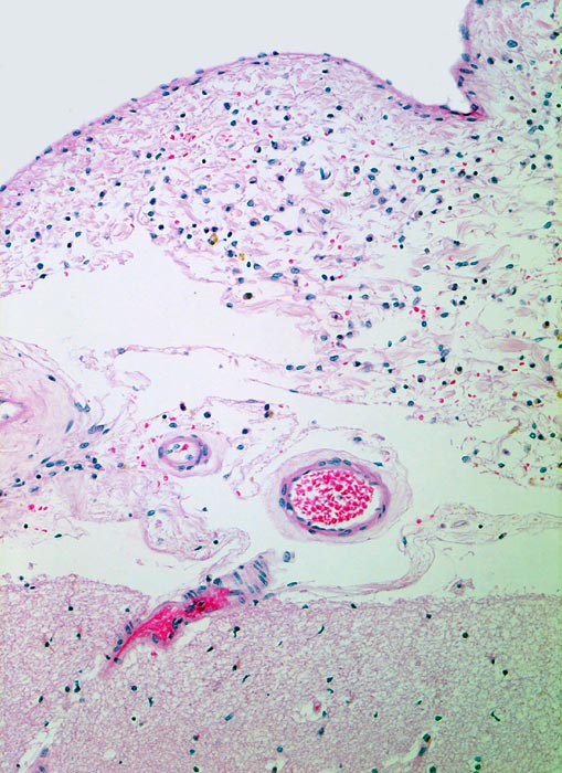 Der makroskopische Befund bei bakterieller Meningitis kann sehr diskret sein. Die meningealen Gefässe sind hyperämisch und die Hirnoberfläche wird von einem grüngelben Eiterbelag bedeckt (eher basal bei Hämophilus influenzae, eher über der Konvexität bei Pneumokokken=Haubenmeningitis). Histologisch ist der Subarachnoidalraum mit Eiter gefüllt. Bei weniger schweren Fällen finden sich die neutrophilen Granulozyten bevorzugt um die leptomeningealen Gefässe.