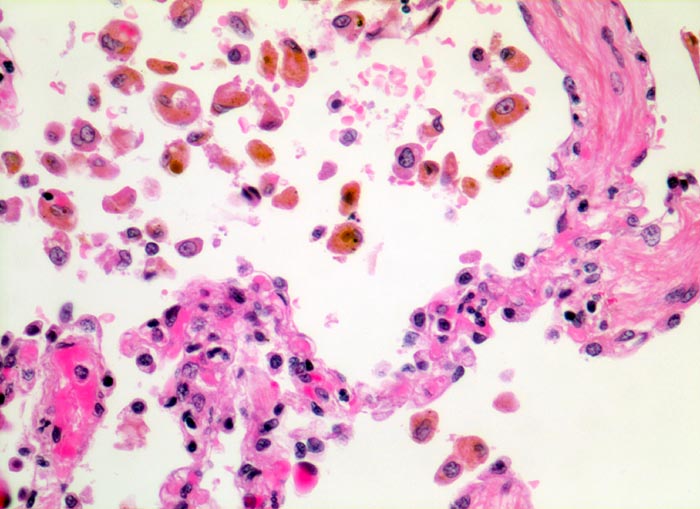 Morphologie: In einer frühen Phase kommt es zur roten Stauungsinduration, welche in eine braune Stauungsinduration übergeht. Die Eindrückbarkeit der Lungen ist aufgrund der Fibrosierung der Alveolarsepten vermindert. Die meist fleckförmige braune Verfärbung beruht auf der Anhäufung von hämosiderinhaltigen Herzfehlerzellen in den Alveolarlichtungen. Makrophagen in den Alveolarlichtungen phagozytieren die ausgetretenen Erythrozyten. Der Nachweis von Erythrozyten im Zytoplasma von Makrophagen spricht für eine frische Blutung. Nach 3-5 Tagen ist in den Makrophagen Hämosiderin nachweisbar. Das Hämosiderin lässt sich mittels Eisenfärbung (Berliner-Blau) zuverlässig von Staubpigment abgrenzen. Als sicheres Zeichen für eine ältere Blutung gelten >20% hämosiderinspeichernde Makrophagen in der bronchoalveolären Lavage (BAL). Die hämosiderinhaltigen Alveolarmakrophagen werden auch Herzfehlerzellen genannt, da sie gehäuft im Rahmen einer linkskardialen Stauung bei Mitralklappenstenose auftreten. Aufgrund des erhöhten Druckes in den Lungenkapillaren kommt es zur sekundären Pulmonalarteriensklerose. Die Befunde an den Pulmonalarterien sind bei primärer und sekundärer pulmonaler Hypertonie prinzipiell gleich. Die Pulmonalarterienhauptstämme zeigen Atherombildungen ( 3698)( 3589) und eine Mediafibrose. Die elastischen Pulmonalarterienäste entwickeln atheromatöse Polster, welche makroskopisch als gelbe Flecken erkennbar sind. Ulzera oder Verkalkungen wie in den Arterien des grossen Kreislaufes werden jedoch kaum beobachtet. Die Veränderungen an kleineren muskulären Arterien (Mediahypertrophie, zelluläre Intimaproliferation, Intimafibrose, Wandnekrosen bei sehr hohen Drücken) und Venolen (Venulosklerose) sind nur histologisch nachweisbar.