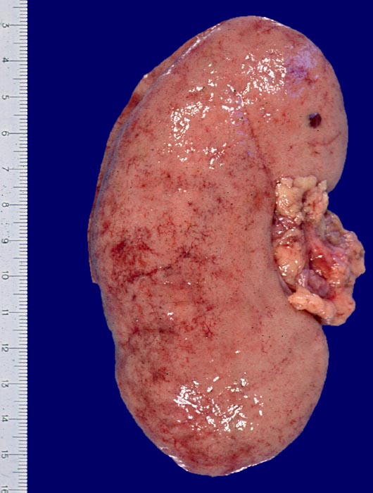 In den beteiligten Organen sind nicht alle Arterien pathologisch verändert und oft ist die Gefässwand nicht zirkulär sondern nur segmental betroffen und die Gefässveränderungen befinden sich in unterschiedlichen Stadien. Folgen der Gefässveränderungen sind Infarkte und Mikroaneurysmata. Die Nieren sind im akuten Stadium oft vergrössert. An der Oberfläche sind Petechien neben unterschiedlich grossen Infarkten erkennbar. Gelegentlich erkennt man auf der Schnittfläche Gefässaneurysmata, thrombosierte Arterien und Papillennekrosen. Im häufigeren chronischen Stadium sind die Nieren verkleinert und aufgrund von Infarktnarben grob gebuckelt.