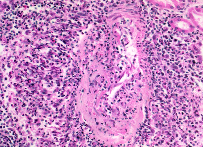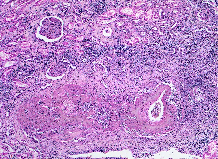 Befallen sind prärenale und grössere intrarenale Nierenarterienäste bei meist fehlender Beteiligung der Arteriolen und definitionsgemäss fehlendem Befall der glomerulären Kapillaren. Die betroffenen Gefässe zeigen segmentale transmurale oft durch Thrombosierung komplizierte Wandnekrosen mit initial granulozytenreichem Infiltrat. Im Verlauf werden die Nekrosen durch Granulations- und Narbengewebe organisiert. An grossen Arterien kann dies zu Knotenbildungen und Aneurysmata führen. Oft findet man in ein und demselben Gefäss frische Nekrosen neben reparativen Veränderungen und Narben. Das übrige Nierengewebe zeigt als Folge der Vaskulitis Kollapsglomerula, Infarkte und ischämische Tubulusatrophie mit begleitender interstitieller Fibrose und Entzündung.