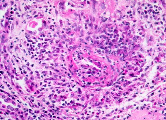 Abgeheilte Vaskulitis: Segmentaler oder kompletter Verlust der elastischen Fasern in mittleren und grossen Gefässen assoziiert mit zellarmer Vernarbung der Gefässwand.