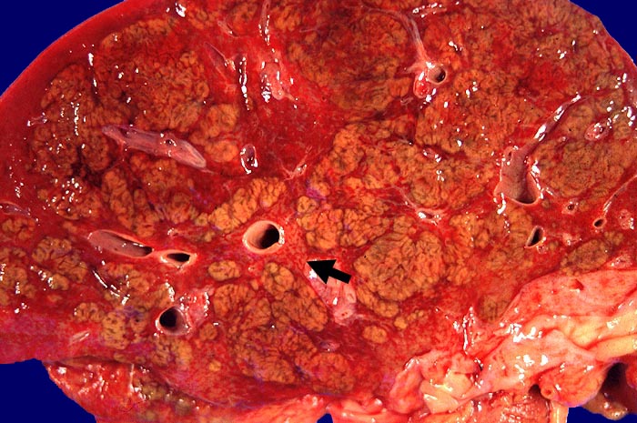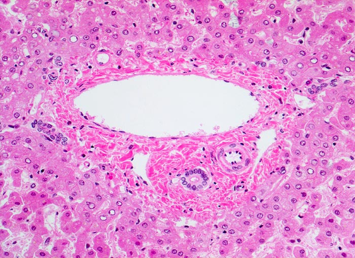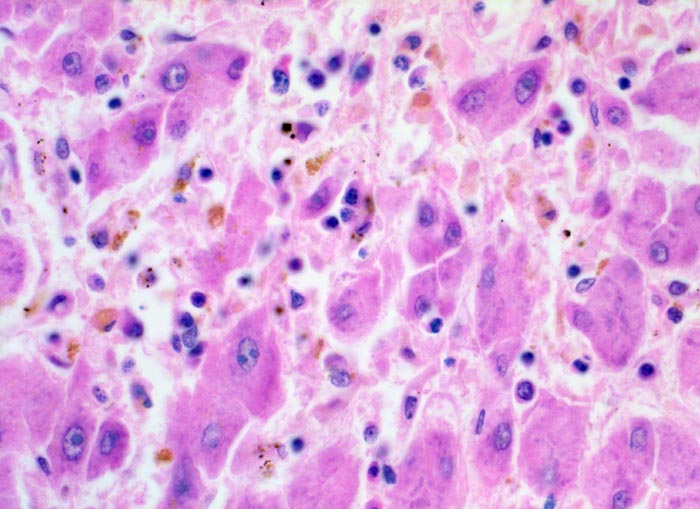 Das histologische Bild der akuten Hepatitis vom Virustyp ist gekennzeichnet durch eine lobuläre Entzündung bei fehlender portaler Fibrose und nur geringer entzündlicher Infiltration der Portalfelder. Es finden sich ballonierte Hepatozyten, Apoptosen ( 1164) und fleckige Nekrosen. Perivenuläre Nekrosen, Brückennekrosen oder konfluierende multilobuläre Nekrosen und eine läppchenzentrale Cholestase können vor allem in klinisch fulminant verlaufenden Fällen nachgewiesen werden. Zahlreiche Makrophagen, welche Diastase-PAS positives Zeroidpigment ( 4319) von phagozytierten nekrotischen Hepatozyten enthalten, zeugen im subakuten Stadium von einer abgelaufenen akuten Hepatitis mit Parenchymnekrosen. Eine Unterscheidung der verschiedenen Typen der viralen Hepatitis und einiger Formen medikamentöser Hepatitiden gelingt rein morphologisch aufgrund des unspezifischen Bildes meist nicht. Für eine ätiologische Klassifizierung sind zusätzliche klinische Angaben erforderlich (Anamnese, Medikamente, Serologie).