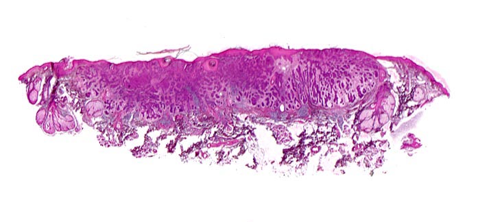 • Solide blaue Tumorzellplatten in der Dermis, teils mit Kontakt zur Epidermis.