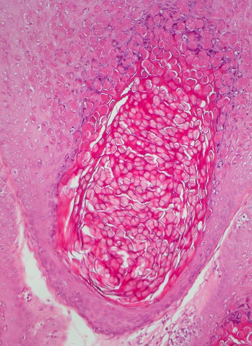 Die Epidermis ist akanthotisch und kann bis zu 6 mal dicker sein als normal. Die Basalzellen sind etwas vergrössert und hochprismatischer. Das Molluscum Körperchen ist das Ergebnis einer viral induzierten Zytoplasmareaktion. Die multiplen intrazytoplasmatischen Einschlüsse enthalten Viruspartikel. Die Viruspartikel werden grösser in Richtung Granularzellschicht und verdrängen den Zellkern zur Seite. Die Dermis unterhalb des infizierten Molluscum Körperchens ist abgesehen von gelegentlich nachweisbaren Entzündungszellen unauffällig.
