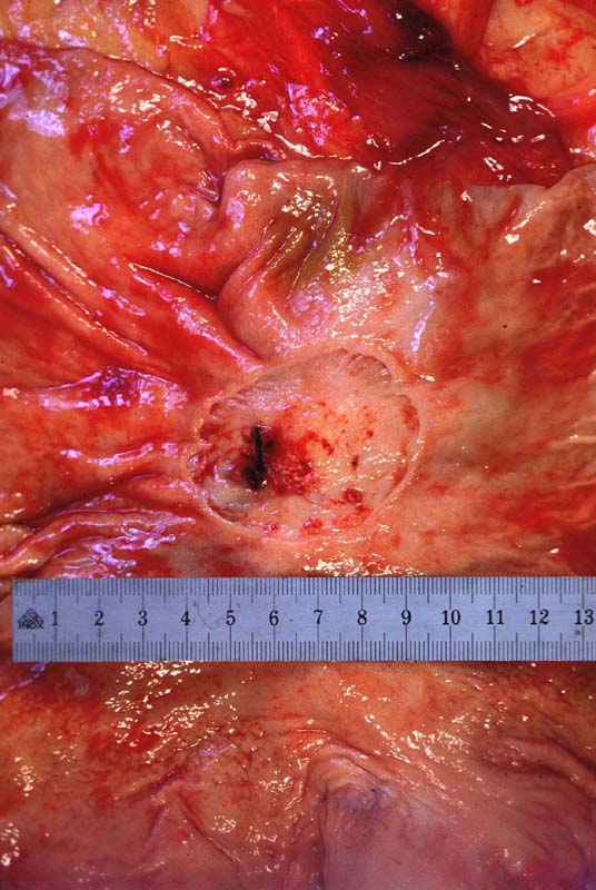 Das akute Ulkus ist rund, oval oder seltener polyzyklisch begrenzt und liegt meist im Schleimhautniveau. Das chronische Ulkus ist häufig kreisrund und im Längsschnitt trichter- oder treppenförmig. Die Schleimhautränder können lippenförmig über den Ulkusgrund hinausragen. Palpatorisch ist das chronische Ulkus aufgrund der narbigen Fibrose induriert. Die Schleimhautfalten laufen sternförmig auf das Ulkuszentrum zu. Das chronische Ulkus tritt zu 10%, das akute zu 25% multipel auf. Mikroskopisch zeigt das chronische Ulkus eine typische Schichtung (s. Bilder). Die Gefässe im Ulkusgrund zeigen eine starke Intimaproliferation mit teilweiser oder vollständiger Obliteration der Gefässlichtung. Morphologische Veränderungen in der übrigen Magenschleimhaut geben einen Hinweis auf die Ätiologie des Ulkus (Typ B oder C Gastritis).