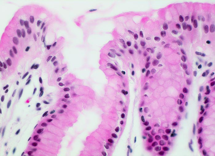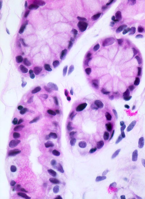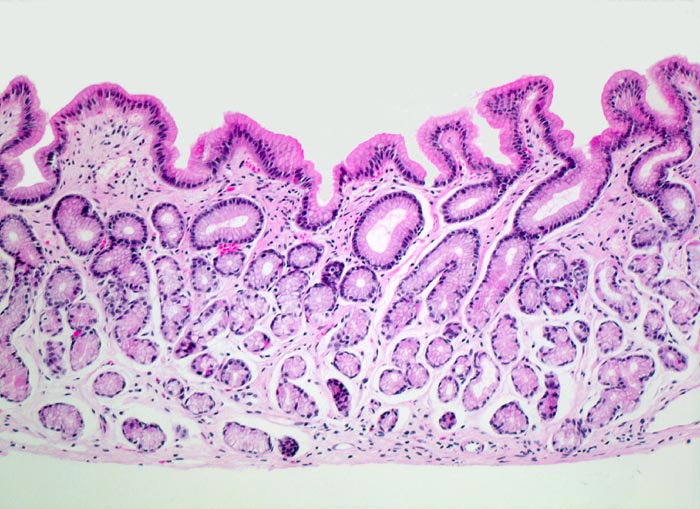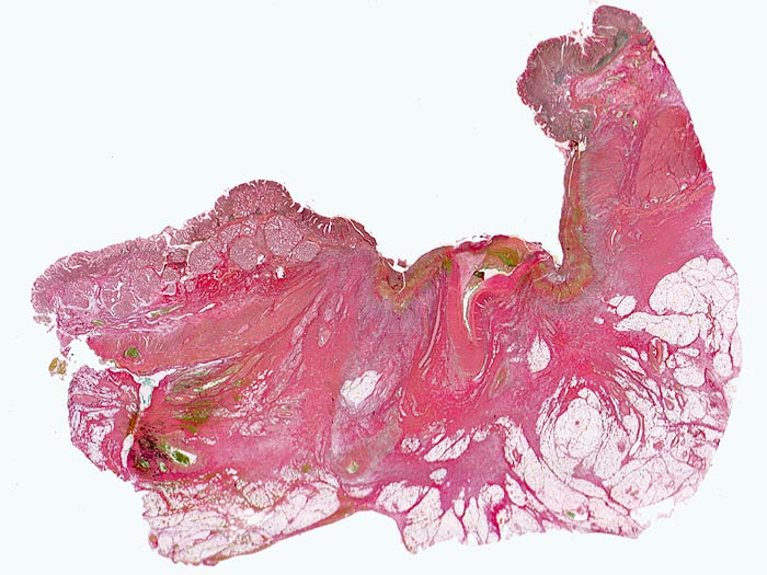 • Duodenalschleimhaut mit Brunner'schen Drüsen am unteren Rand des Ulkus.