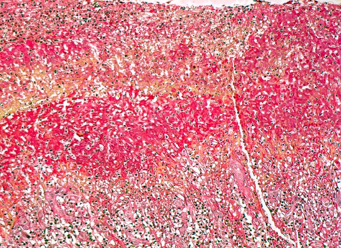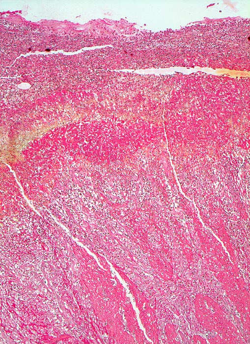 • Schichtung: Detritus, oranges Quellungsfibrinoid, Granulationsgewebe, Narbe.