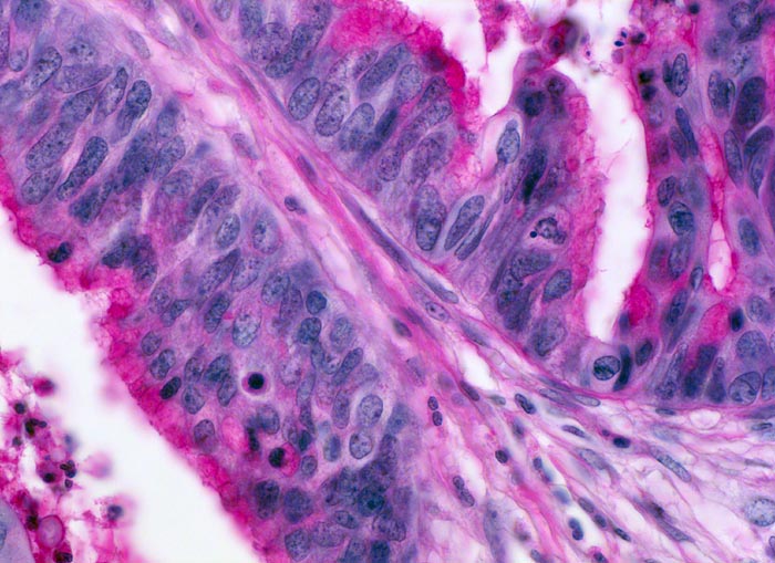 Die meisten Adenokarzinome des Kolons bilden Drüsen. Die Drüsenlumina enthalten oft nekrotischen Detritus und variable Mengen von Schleim. Der intraluminale nekrotische Detritus findet sich oft auch in den Metastasen kolorektaler Karzinome und gibt einen morphologischen Hinweis auf die Lokalisation des Primärtumors, wenn nur Gewebe aus einer Metastase für die histologische Untersuchung zur Verfügung steht.