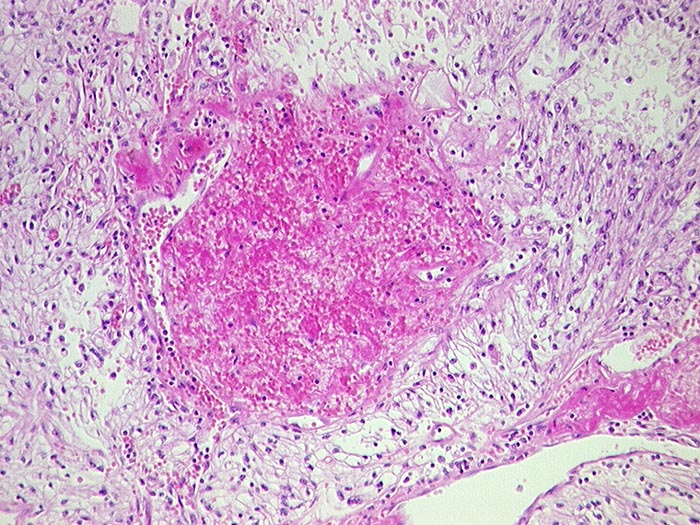 Tumorzellen mit klarem Zytoplasma und deutlichen Zellgrenzen. Einblutung.