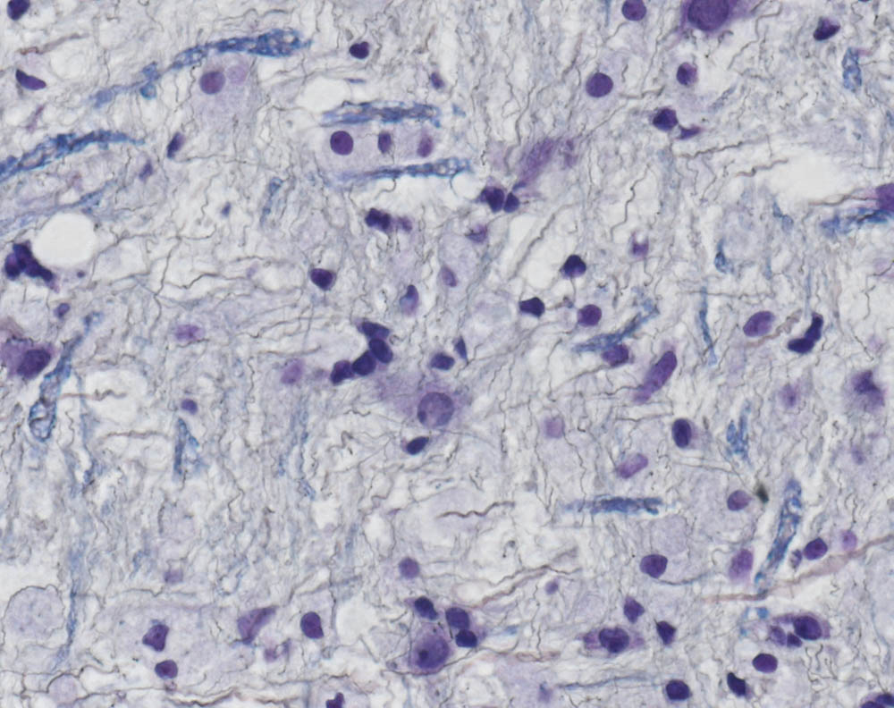 Im Randbereich der Läsion finden sich Marksubstanzanteile, welche in der Holmes-Luxol-Darstellung regelrecht bemarkte Axone zeigen. Die entmarkten Axone sind als feine schwarze Linien erkennbar.