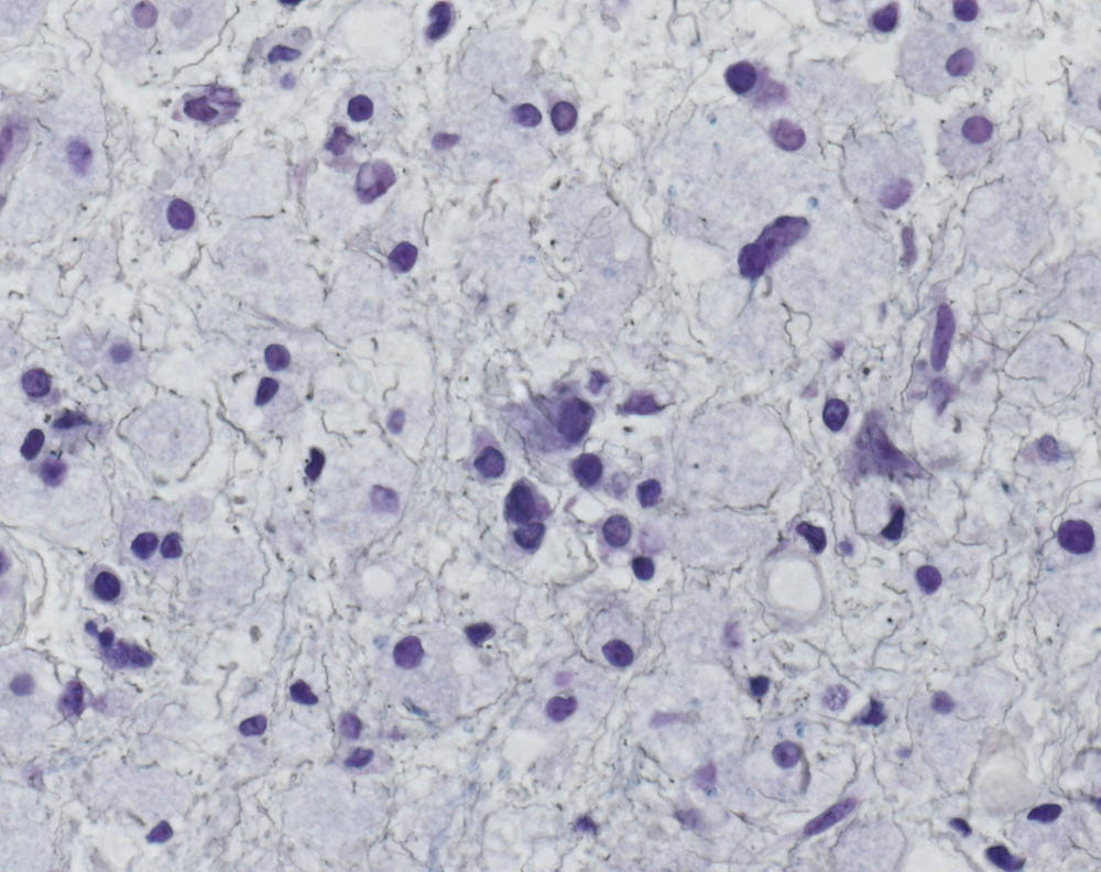 Entmarkungsprozess, welcher durch äusserst zahlreiche Makrophagen charakterisiert ist, welche zum Teil Myelindebris enthalten. Durch den Entmarkungsherd ziehen zahlreiche, sogenannt nackte, d.h. entmarkte, Axone.