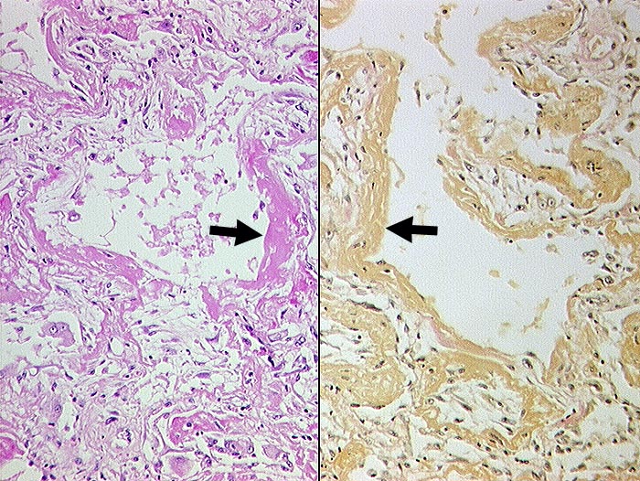 Links im HE hyaline, auf den Alveolarwänden aufsitzende Membranen. Diese bestehen aus Fibrin (gelb in der van Gieson Färbung rechts).