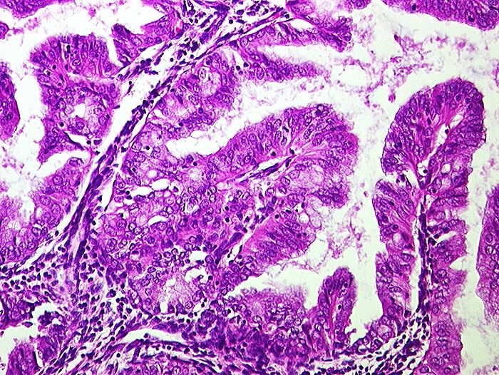Proliferierte Drüsen mit mehrrehigem Epithel und stark reduziertes Stroma. Die proliferierten Drüsen zeigen komplexe architektonische Muster mit papillären und pseudopapillären Epithelaussprossungen. Die Kerne sind abgerundet und vergrössert.
